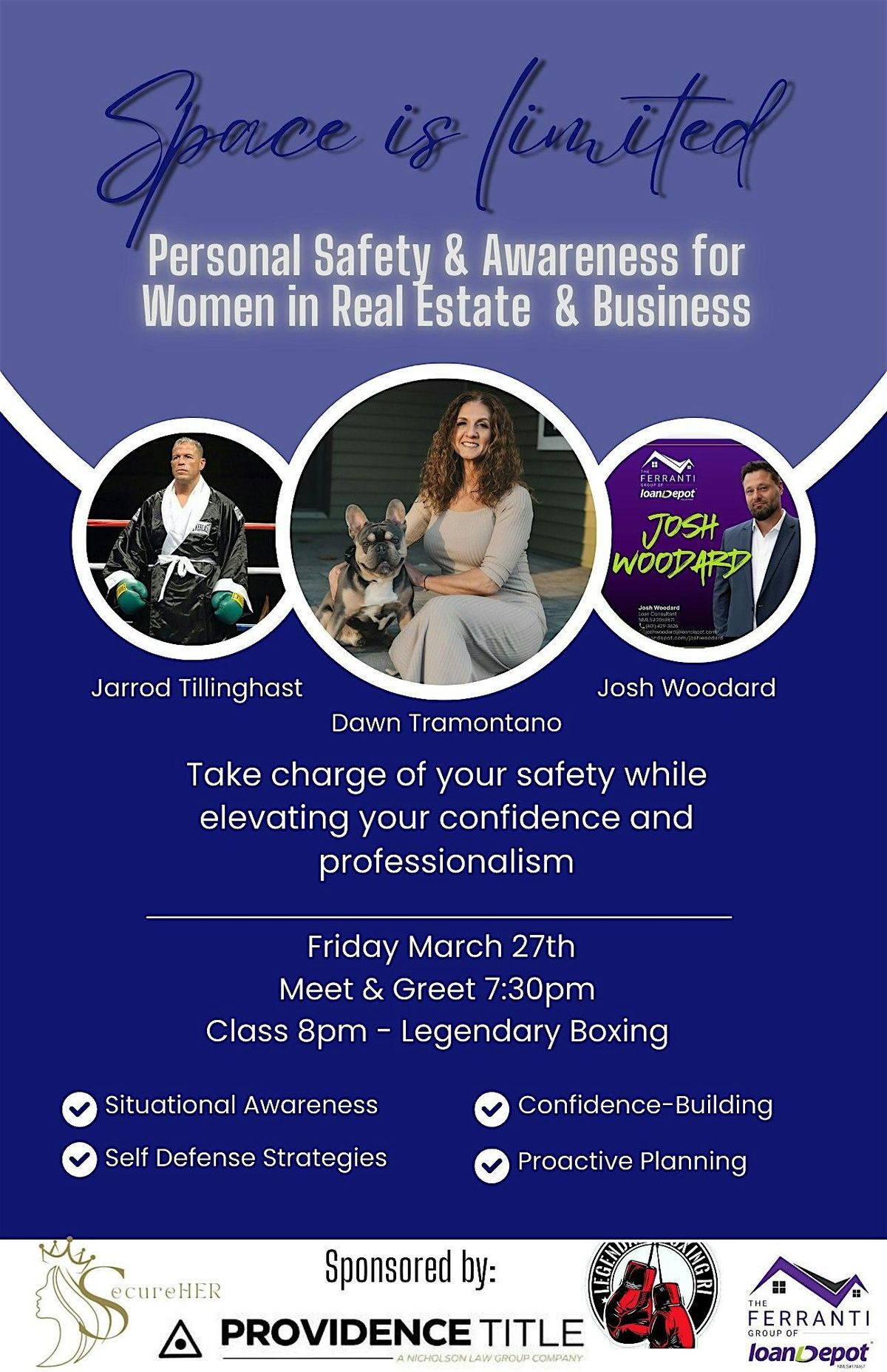 Are you a woman in Real Estate and Business? Ready to boost your confidence and learn some essential safety tips? This in-person workshop is designed just for you. We'll cover everything from situational awareness to practical self-defense strategies. It's a relaxed, interactive session where you can connect with other awesome women and feel empowered. This specialized workshop is compliments of the SecureHER program, and will be taught by Jarrod Tillinghast at Legendary Boxing. Business women often find themselves in vulnerable scenarios, such as meeting clients alone or entering unfamiliar properties, making it essential to be proactive and prepared. In this engaging and practical workshop, you'll learn how to stay alert and conscious of your surroundings while navigating client meetings, property showings, and solo appointments. So click the link to register to take charge of your safety while elevating your confidence and professionalism. Meet and Greet at 7:30pm, Special Guests and Sponsors Josh Woodard from Loan Depot, The Ferranti Group and Anthony Marsella and Richard Nicholson from Providence Title. Class starts at 8pm and gloves will be provided. Don't miss out on gaining skills that can make a real difference in your daily life!