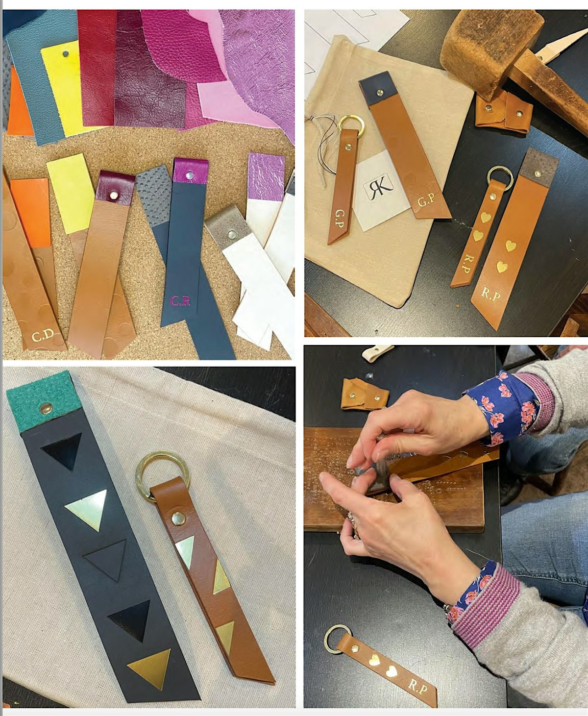 You will select from a choice of neutral leather colours for your keyring and bookmark, with additional options of a polka dot printed leather. From a range of colourful leather off cuts, including foil and printed leather you can add further detailing and pops of colour. You will learn how to burnish edges, add silver or brass rivets and how to operate the hot-foil machine to add initials or prints from a range of foil colours or de-bossed options.