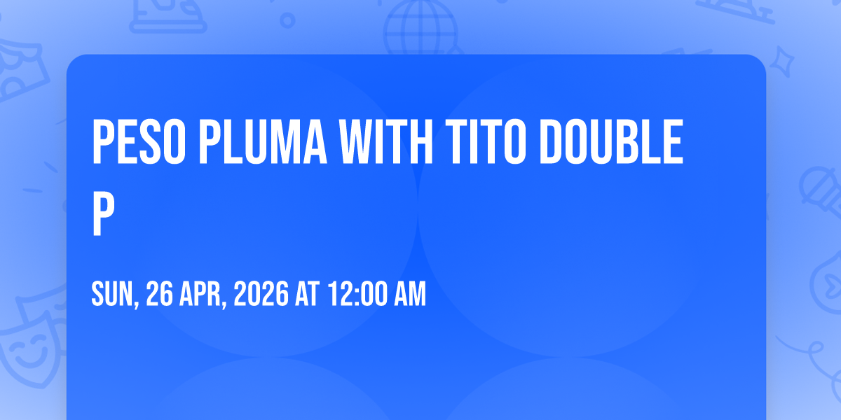 π Location: 35.3272, -80.7123π Welcome to Peso Pluma with Tito Double P, where the impossible becomes possible and dreams take flight! ποΈ Join us at Truliant Amphitheater in the heart of Charlotte, NC for an event that will redefine your expectations. π On April 26th, 2026 at 12:00 AM, witness the transformation of space and time into something truly magical. β¨ It's a curated experience combining the best of innovation, entertainment, and community spirit, creating moments that will be remembered for years to come. Whether you're a first-time visitor or a seasoned enthusiast, prepare to be amazed. π Book now to ensure your place in this unforgettable experience!