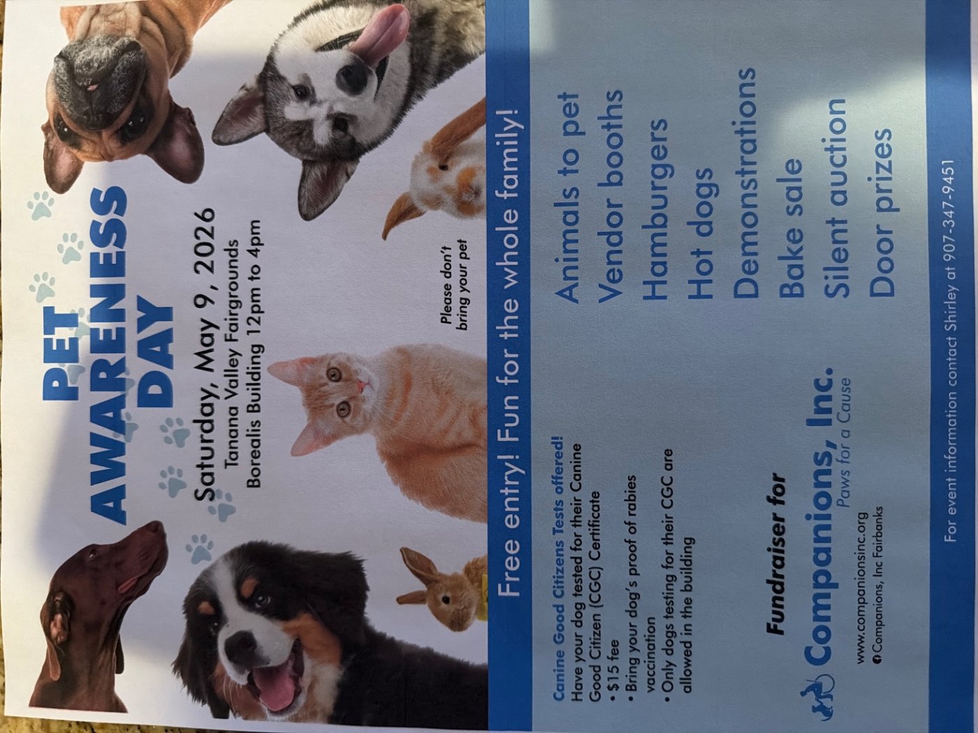 Join us for our annual Pet Awareness Day fundraising event for Companions, Inc. Enjoy lots of animals to pet, a bake sale, Smooch the Pooch kissing booth, lots of vendors, grilled hamburgers and hotdogs and an amazing silent auction. This is a family event FREE to the public. Please join us. Call Shirley at (907) 347-9451 for more details
