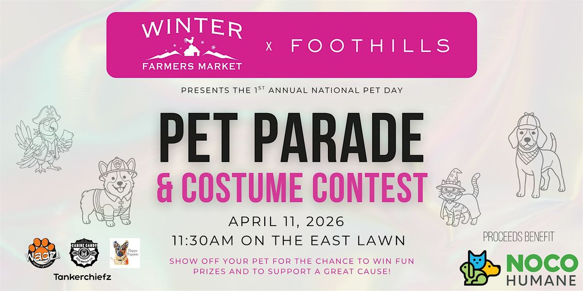 This is the First Annual National Pet Day Pet Parade and Costume Contest, a co-sponsored community event hosted at the Fort Collins Winter Farmers Market at Foothills Mall (located 215 E Foothills Pkwy, Fort Collins, CO 80525) on the East Lawn. The event is designed to celebrate National Pet Day along with our small business vendors, and benefit the Larimer County Humane Society through entry fee donations.