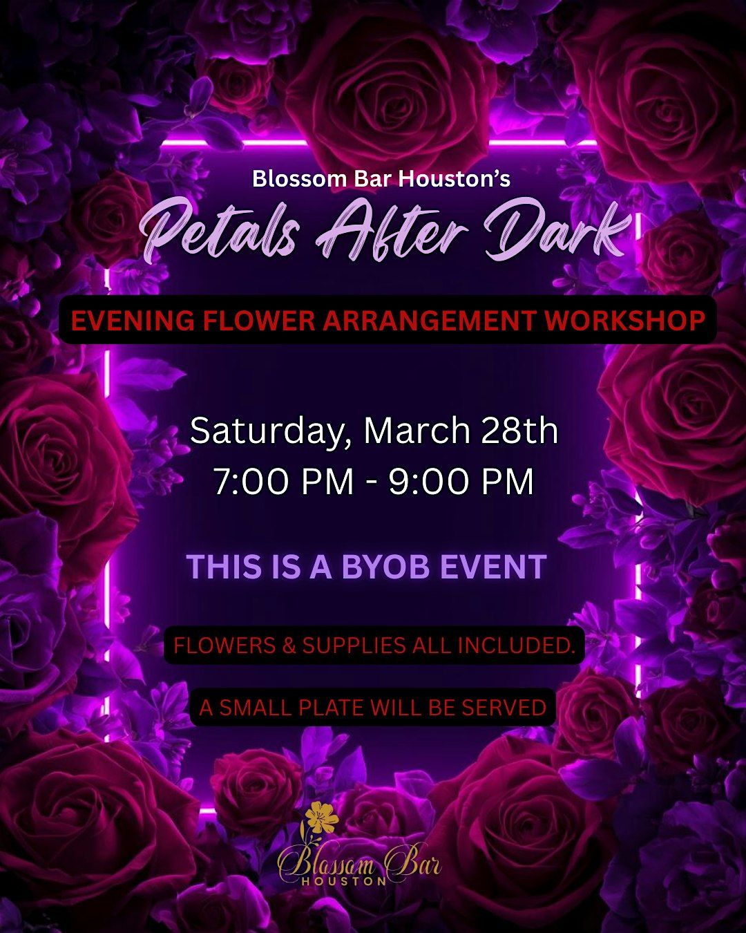 This is a BYOB experience. You do not need to bring anything except your beverage of choice. All flowers, premium vases, tools, and supplies are included. Light bites will be served. Simply arrive ready to create.