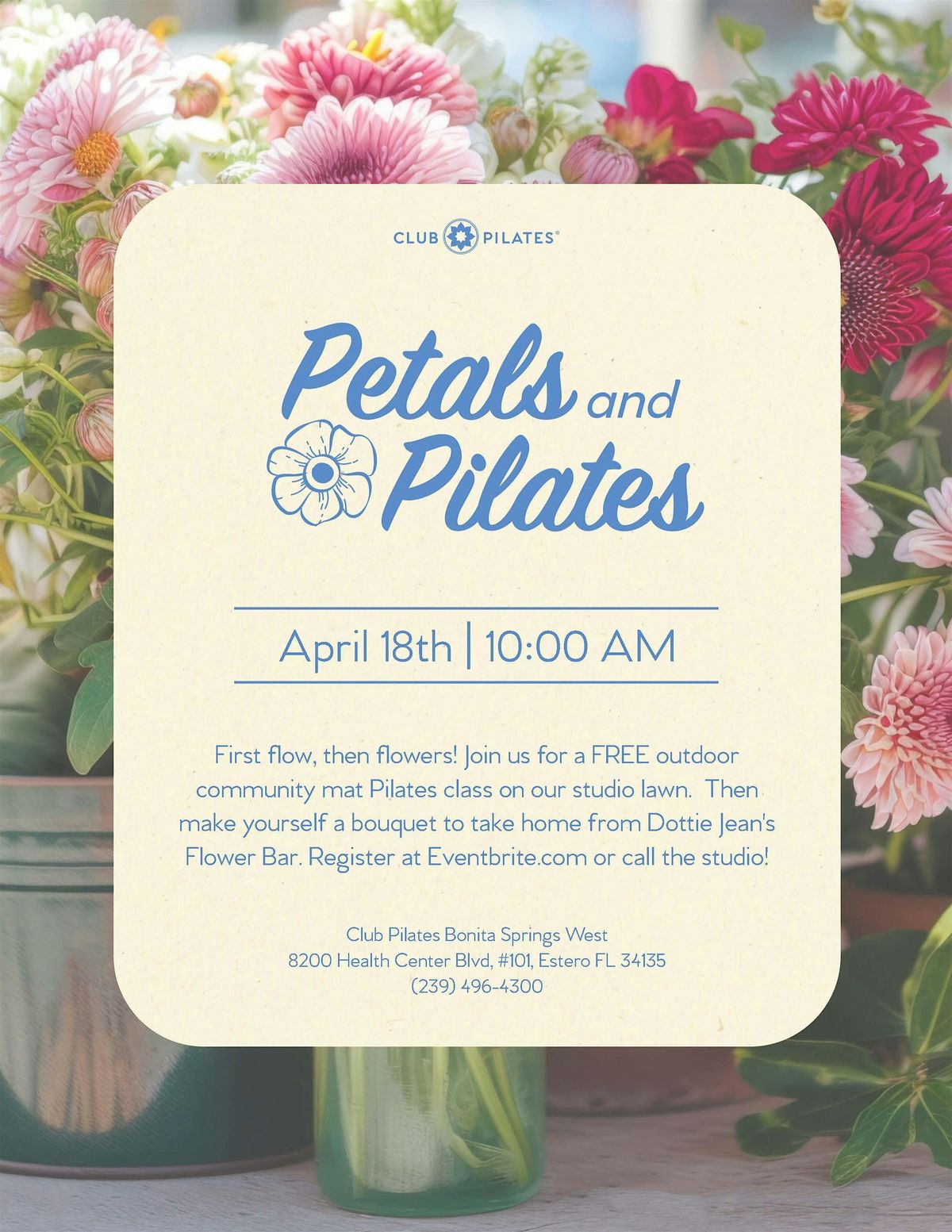 First flow, then flowers! Bring your mat for this FREE 50-minute Pilates flow then make yourself a bouquet to take home from Dottie Jean's Flower Truck Bouqet Bar. Bring a non-member friend and be entered to win our exclusive Club Pilate spring prize basket!