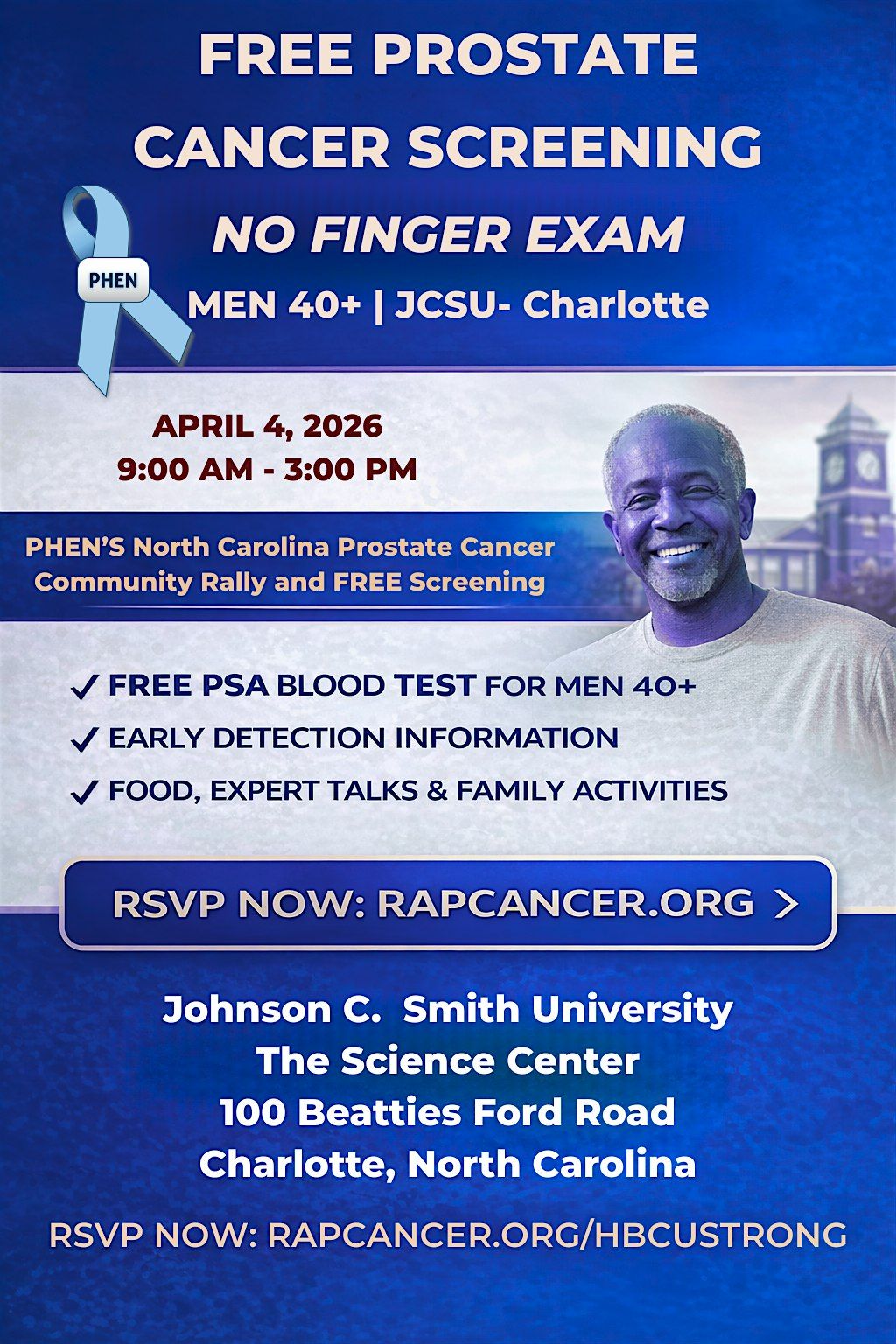 We’re bringing FREE prostate cancer screening to the campus of Johnson C. Smith University. Join PHEN at JCSU’s The Science Center for a Community Rally featuring: