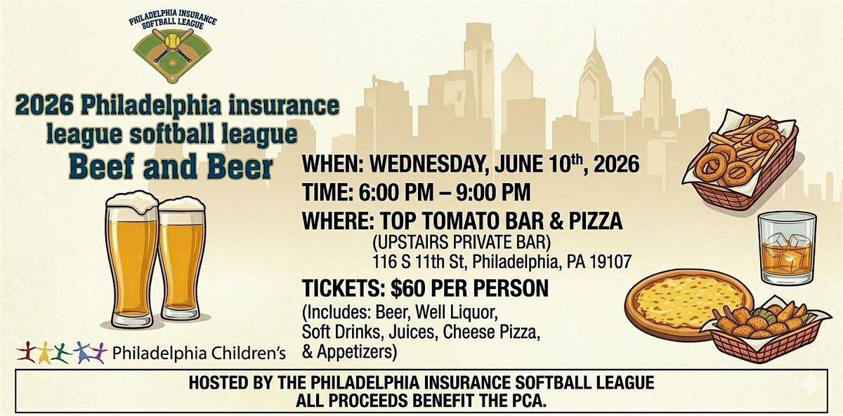 The 2026 Philadelphia Insurance League Softball League is hosting a "Beef and Beer" fundraising event on Wednesday, June 10th, 2026, from 6:00 PM to 9:00 PM at Top Tomato Bar & Pizza (upstairs private bar) in Philadelphia. Tickets are $60 per person and include beer, well liquor, soft drinks, juices, cheese pizza, and appetizers. All proceeds will benefit the Philadelphia Children's Alliance. The event is organized by the Philadelphia Insurance Softball League.