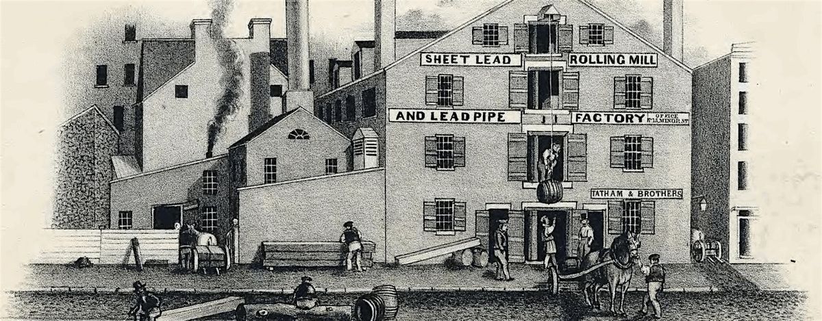 Featured image: Lithograph of an advertisement depicting the Tatham & Brothers factory complex located at 608 Delaware Avenue in Philadelphia, August 1847