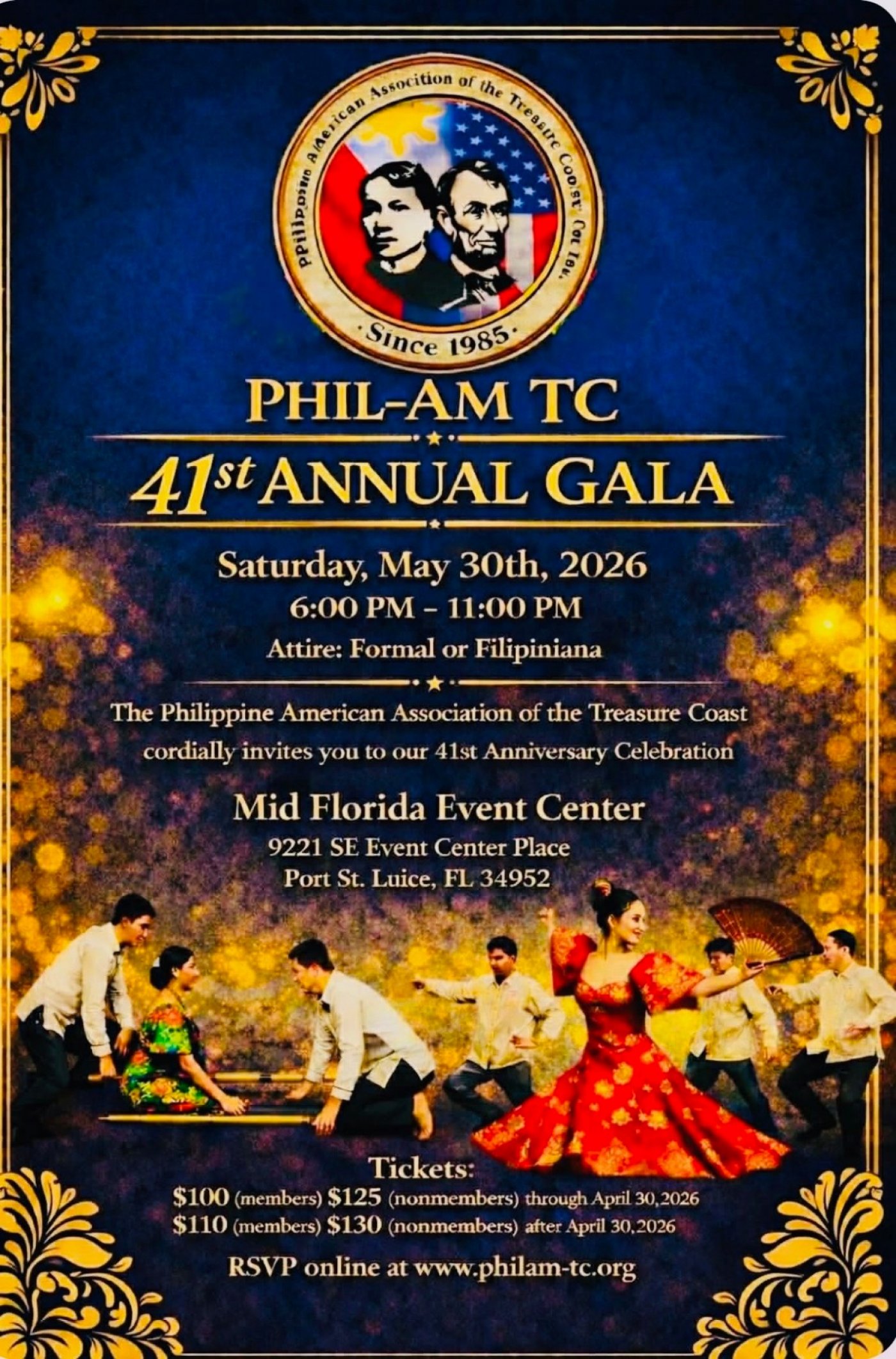 Join us as we celebrate 41 years of culture, community, and connection with the Philippine American Association of the Treasure Coast. Enjoy an evening filled with vibrant Filipino cultural dances, festive energy, and a beautifully prepared dinner. Your presence makes a real difference β all proceeds from this special celebration will help provide scholarships for deserving IRSC students.