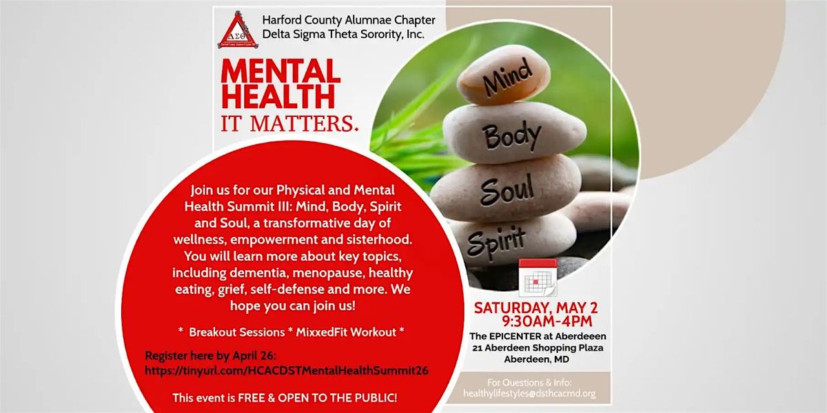 - May is Mental Health Awareness Month. Join the Harford County Alumnae Chapter of Delta Sigma Theta Sorority, Inc. for our Physical and Mental Health Summit III: Mind, Body, Soul and Spirit, a transformative day of wellness, empowerment and sisterhood. You will learn more about key topics, including dementia, menopause, healthy eating, grief, self-defense and more. The event concludes with a high-energy, MixxedFit workout that is sure to strengthen the body, refresh the mind, energize the spirit and bring joy to the soul. We hope you can join us!