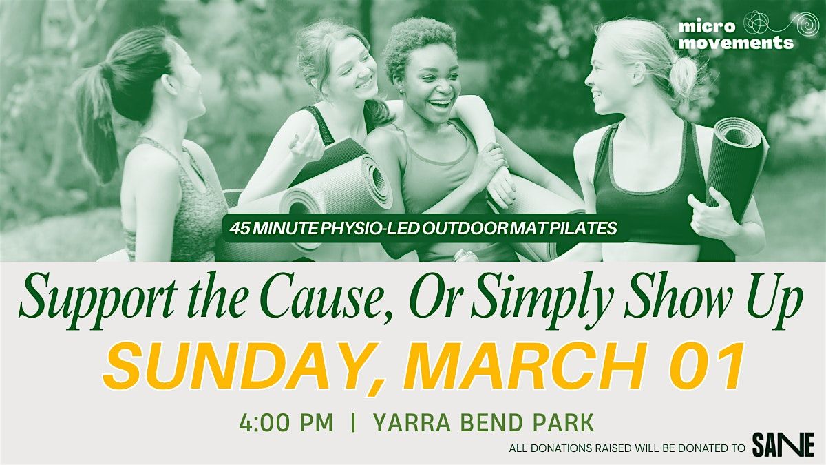 A 45-minute Physio-Led Pilates for a Cause 🧘♀️ session on Sunday, March 1 at Yarra Bend Park, Kew.