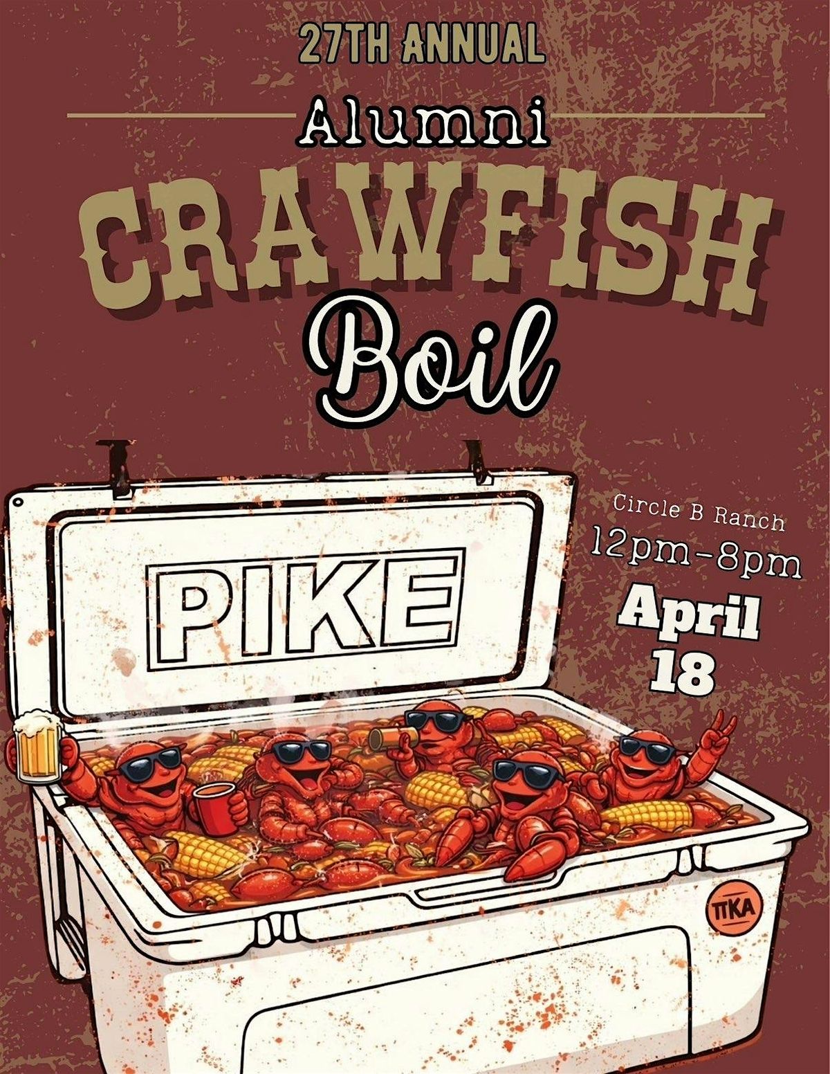 Join us for the 27th Annual Pi Kappa Alpha Alumni Crawfish Boil on April 18, 2026, hosted by the Pi Kappa Alpha Alumni Association at Circle B Ranch!