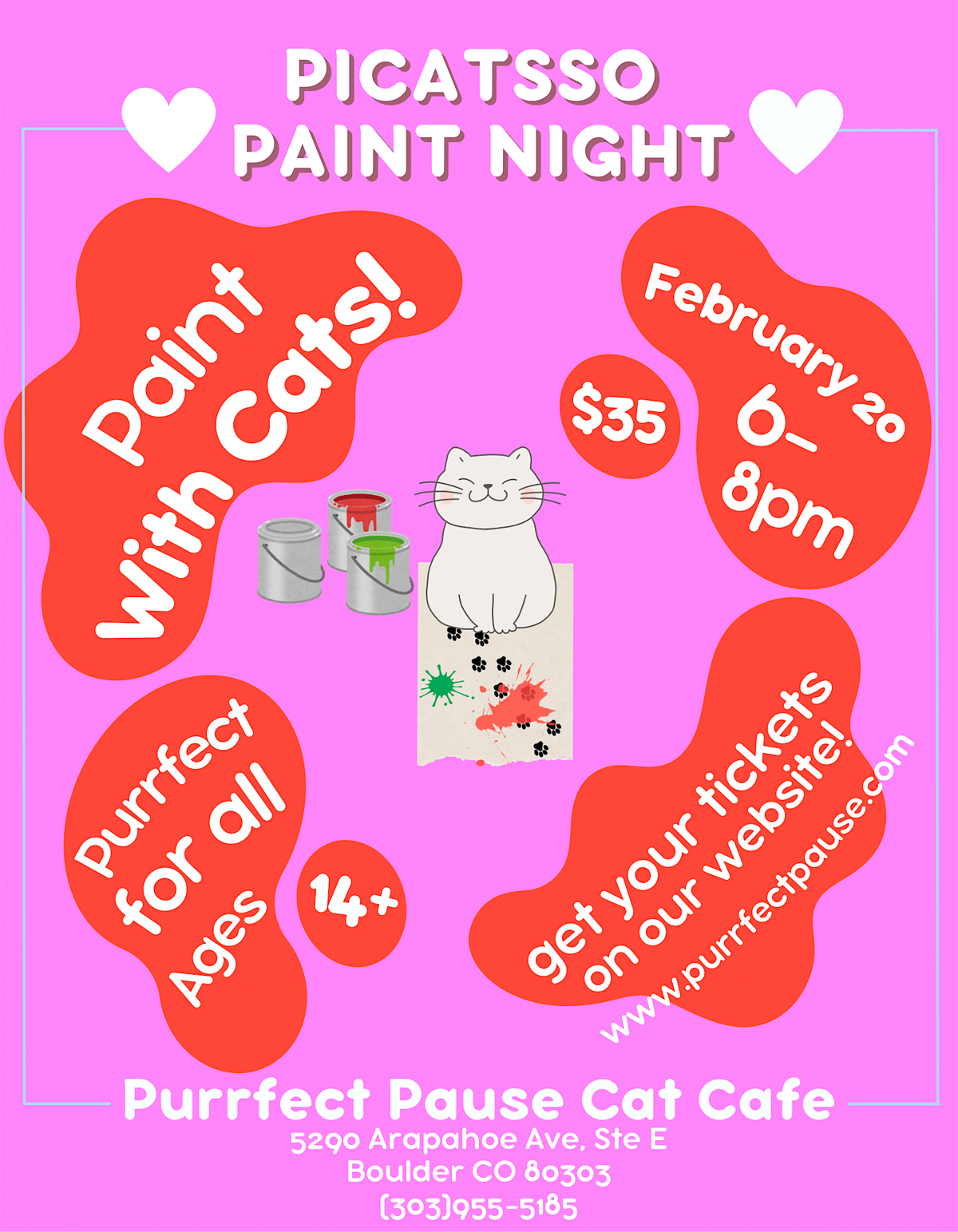 Join Purrfect Pause Cat Cafe as we host our fan favourite event Picatsso Paint Night! All cat lovers age 14+ are welcome! At PiCatsso paint night, you’ll be guided through how to create your own cat-themed masterpiece to take home! Our directing artist, Mira, previously led children's art camps and is a life-long lover of cats! The theme for our next PiCatsso is kitties enjoying holiday fun!