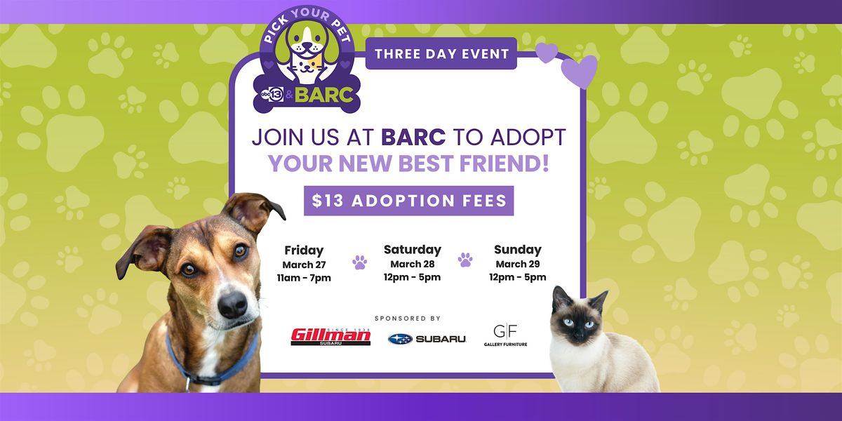 Join us for Pick Your Pet, BARC’s annual adoption drive in partnership with . This year, the event is bigger than ever with three full days of reduced adoption fees to help Houston’s pets find homes.