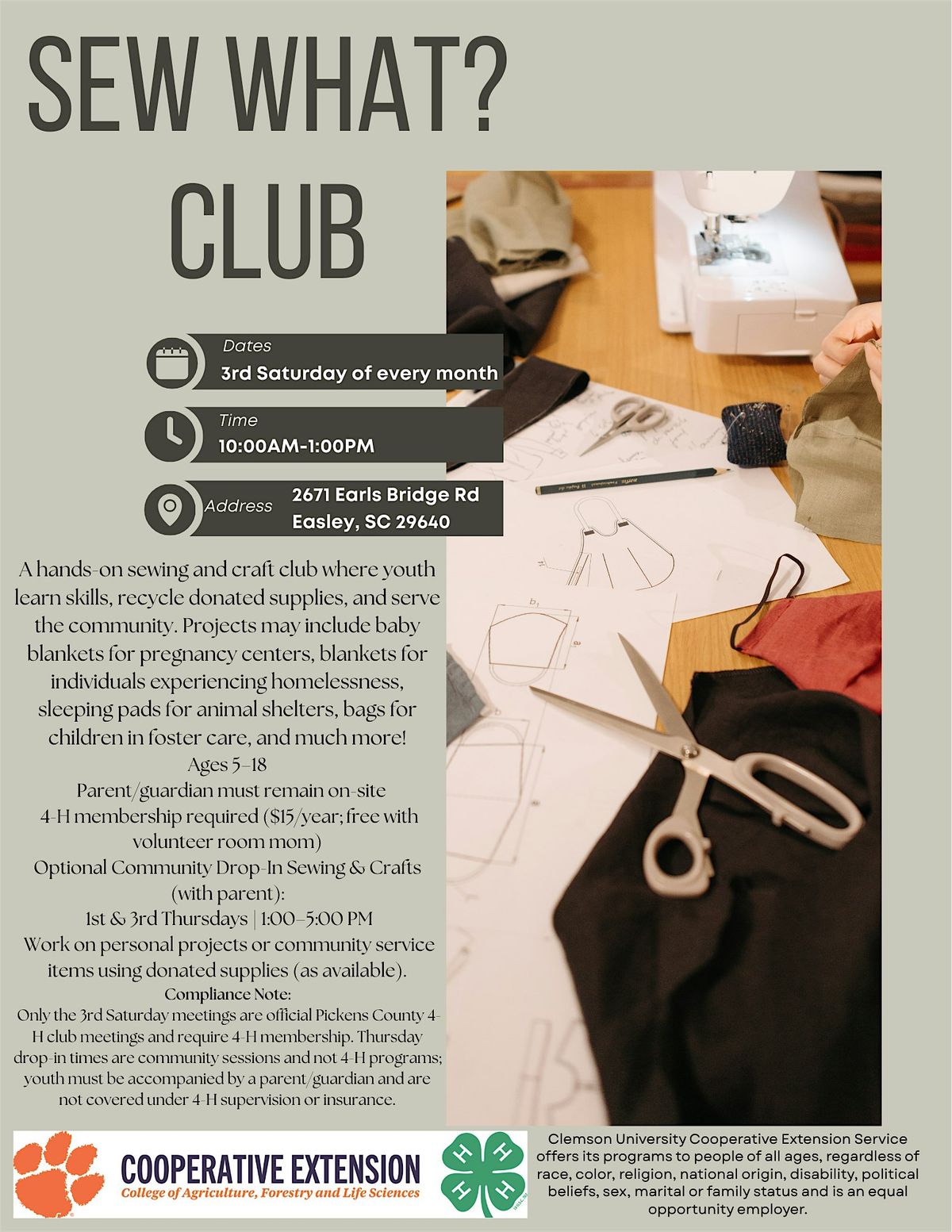 Sew What? Sewing & Craft Club meetings held on the 3rd Saturday of each month are official Pickens County 4-H club meetings and require active 4-H membership, appropriate supervision, and adherence to all 4-H policies and procedures.