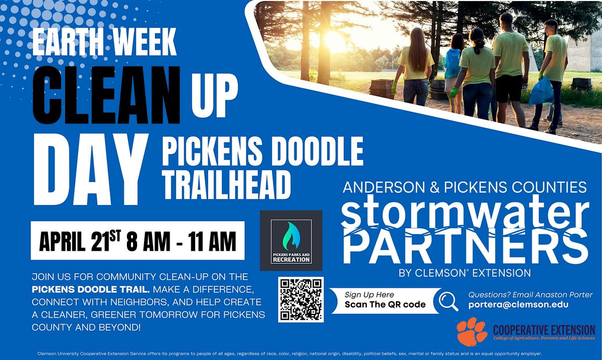 Join Anderson & Pickens County Stormwater Partners (APCSP) a Clemson Extension Service and City of Pickens Parks and Recreation for trash clean up on the Doodle Trail to celebrate the week of Earth Day - We will host our trash clean-up the day before Earth Day on Tuesday, April 21, 2026. The trash clean-up will take place at Pickens Doodle Park (409 E. Cedar Rock Street, Pickens, SC 29671). APCSP will have a table set up at the head of the trail with all of the supplies you will need (trash bags, grabbers, gloves, vests etc.) and some waters and refreshments for volunteers.