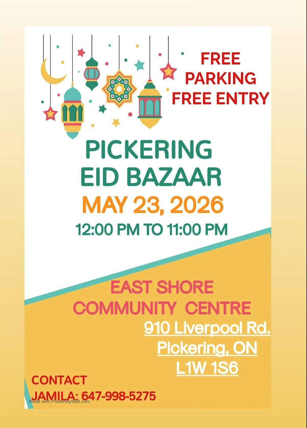Come join us in person at the Pickering Eid Bazaar for a day full of vibrant colors, tasty treats, and fantastic shopping! It's the perfect spot to celebrate, meet awesome people, and soak up the festive vibes. Don’t miss out on the fun – bring your friends and family and enjoy everything this bazaar has to offer!