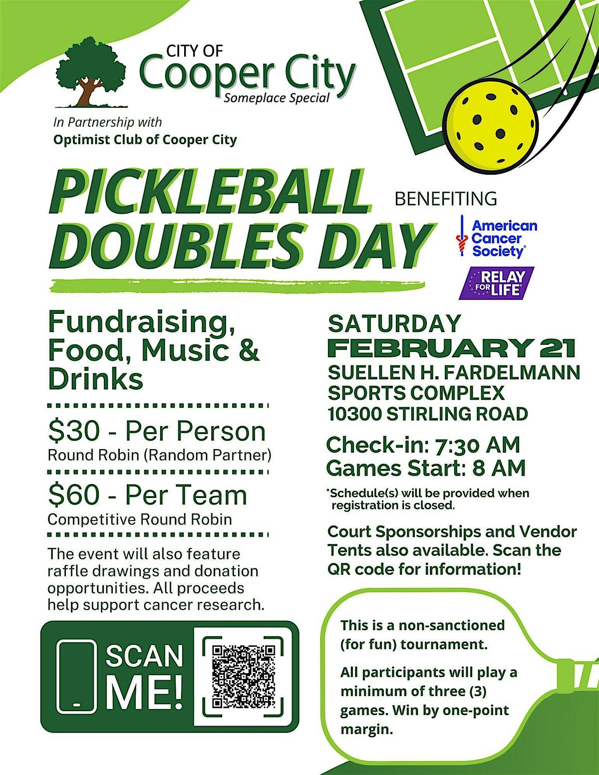 The City of Cooper City and Optimist Club of Cooper City are hosting a Pickleball Doubles Day to benefit the American Cancer Society's Relay for Life. The exciting event offers players the ability to register as a single player to take part in round robin play, where a partner will be selected for them, or a competitive round robin where players can register their team to take on the competition. While plenty of action will be taking place on the court, this tournament will also feature food, drinks, music, vendors and giveaways!