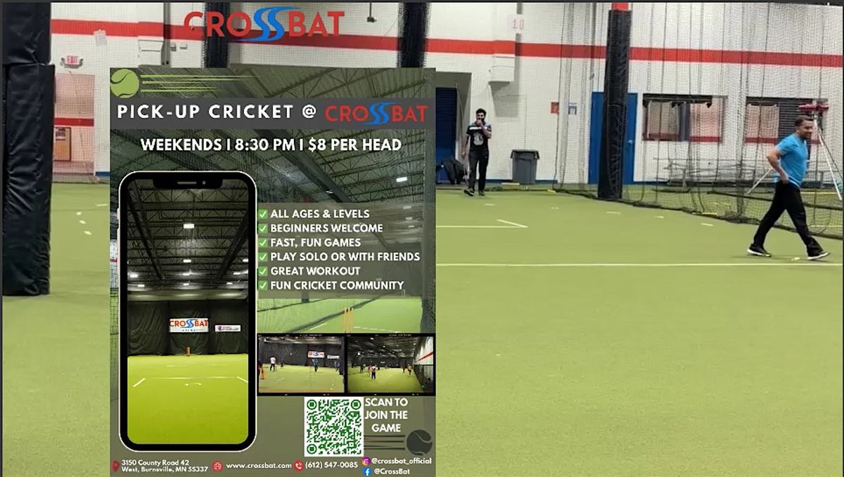 Come join us for a fun game of box cricket at CROSSBAT, Burnsville on Fridays at 8:30 - 10:30 PM (Central Time). Whether you're a seasoned player or just looking to have some fun, this event is perfect for everyone.Expect friendly competition and a good workout. See you there!