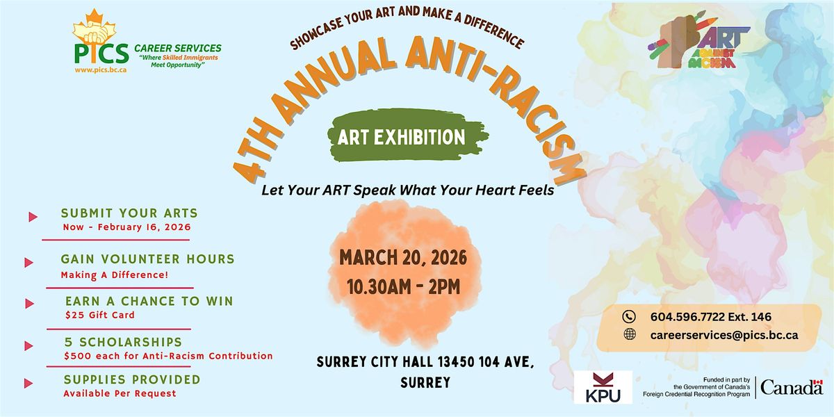 Join us on Fri Mar 20, 2025 at 10:00 AM at Surrey City Hall for a powerful event showcasing art that speaks out against racism. This in-person event will feature talented artists and thought-provoking pieces that aim to promote unity and understanding. Don't miss this opportunity to be part of a movement for change. Register now to secure your spot!