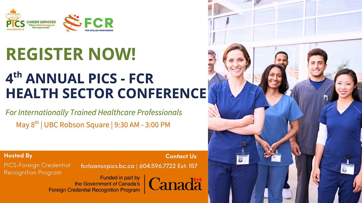 Welcome to the PICS-FCR Health Sector Conference For Internationally trained Healthcare Professionals including IMGs, Nurses, Dentists and Pharmacists etc. Join us on Friday, May 8 2026 at UBC Robson Square for a day filled with networking, learning, and opportunities in the healthcare field.