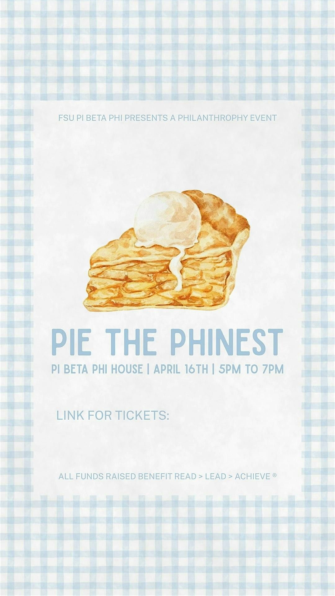 Pie the Phinest is set to take place on Thursday, April 16, 2026 ! The event includes pieing the Pi Phi's Phinest Candidates, dinner and desserts provided. At 6PM, the candidates will be giving a breif introduction about themselves and following with Q&A. At the end, the new Pi Phi's Phinest will be crowned!