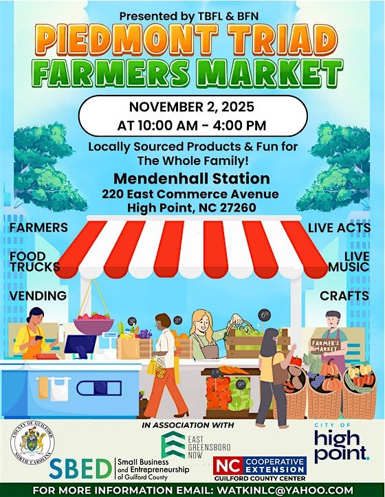 Join us at 220 E Commerce Ave on November 2, 2025 at 10:00 AM for a fun-filled day at the Piedmont Triad Farmers Market! Come and explore a wide variety of fresh produce, artisanal goods, and local crafts. It's a perfect opportunity to support local farmers and businesses while enjoying a vibrant community atmosphere.