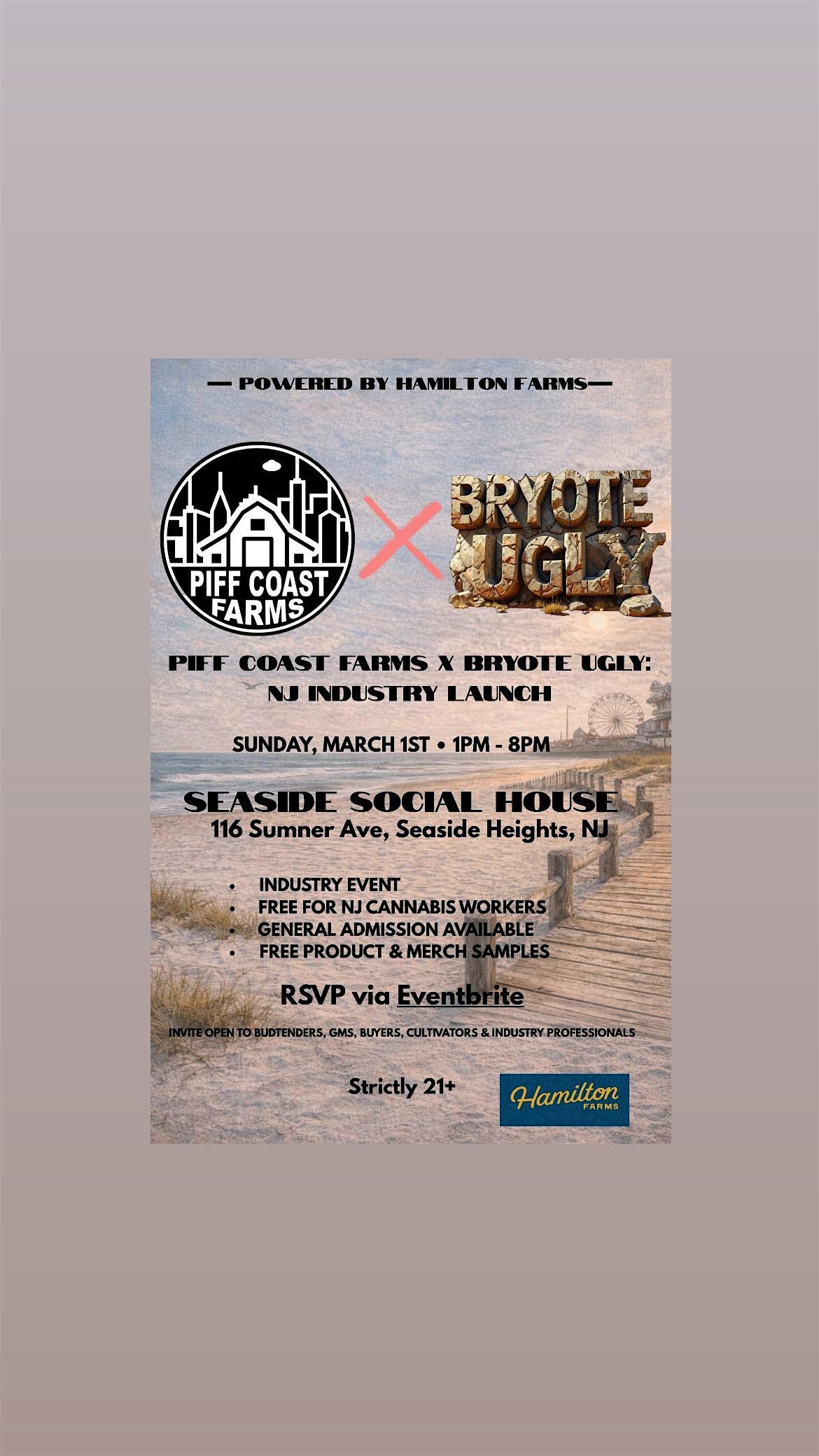 NJ industry launch of Piff Coast Farms x Bryote Ugly. Free for cannabis workers. Samples, merch & networking. 21+ Powered by Hamilton Farms.About this Event