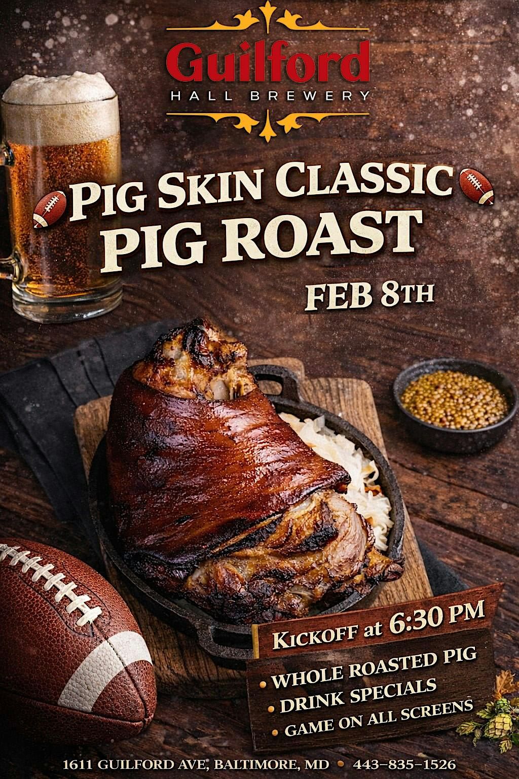 Get ready for an epic in-person bash were the grill is hot and the vibes are even hotter! Join us for the Pig Skin Classic — a legendary pig roast event packed with mouth-watering flavors, FOOTBALL meets great company, and tons of fun. Don't miss out on this tasty gathering where good food and good times come together. Bring your appetite and your best stories!