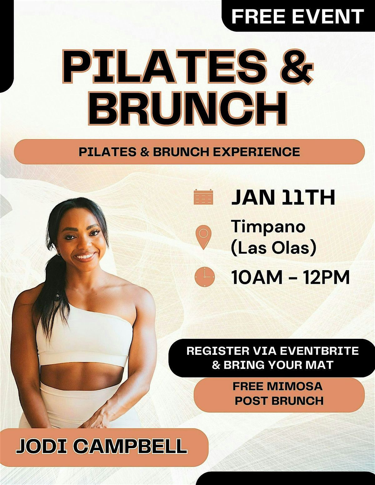 Come join us for a fun morning of movement, live Djing and delicious food at Timpano Las Olas! Our Pilates & Brunch event is the perfect way to start your day with a workout followed by a tasty meal. Get ready to sweat it out with a Pilates workout led by Jodi Campbell, and then refuel with an incredible brunch spread. Whether you're a Pilates pro or a newbie, this event is suitable for all levels. Enjoy community, movement, local vendors, live DJing. Don't miss out on this fantastic opportunity to treat yourself to some self-care and good eats!