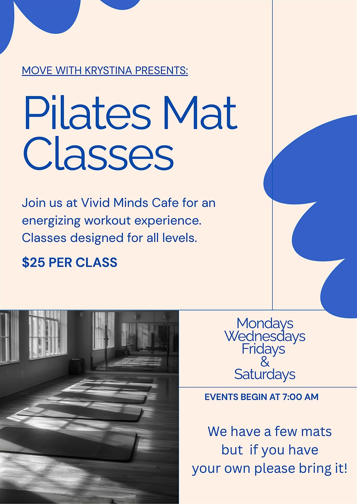Get ready to stretch, strengthen, and flow with us at Vivid Minds Cafe! Join our in-person Pilates Mat session where you'll improve your core, flexibility, and balance—all while having a blast. Whether you're a beginner or a pro, come enjoy a relaxed, friendly vibe and connect with others who love to move. Bring your mat and let’s make fitness fun together!
