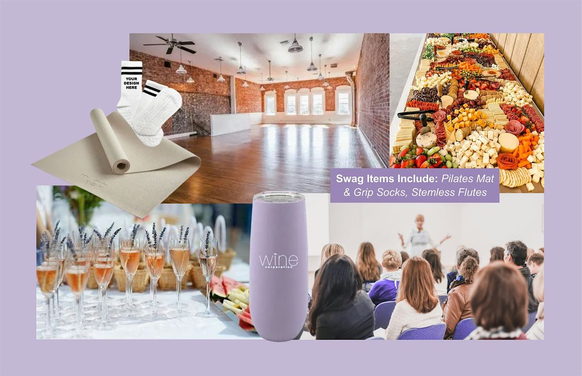 Each attendee will also receive a swag bag including a Pilates mat, grip socks, and a stemless flute to take home.