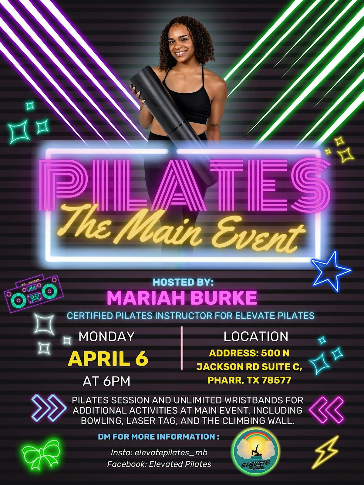 Ignite your fitness journey at Main Event Pharr, Texas's ultimate entertainment hub for an exciting and energizing Pilates class at Main Event Pharr, your ultimate entertainment destination in Texas! Located off I-2 near U.S. 83 and North Jackson Road, Main Event is offering a fantastic atmosphere for fun and fitness with bowling, arcade games, laser tag, gravity ropes, over 100 arcade games, billiards, and more for non-stop family fun!Dive into an awesome mix of wellness and excitement with a beginner-friendly Pilates class in our spacious party room, led by Certified Instructor Mariah Burke from Elevate Pilates, perfect for all !