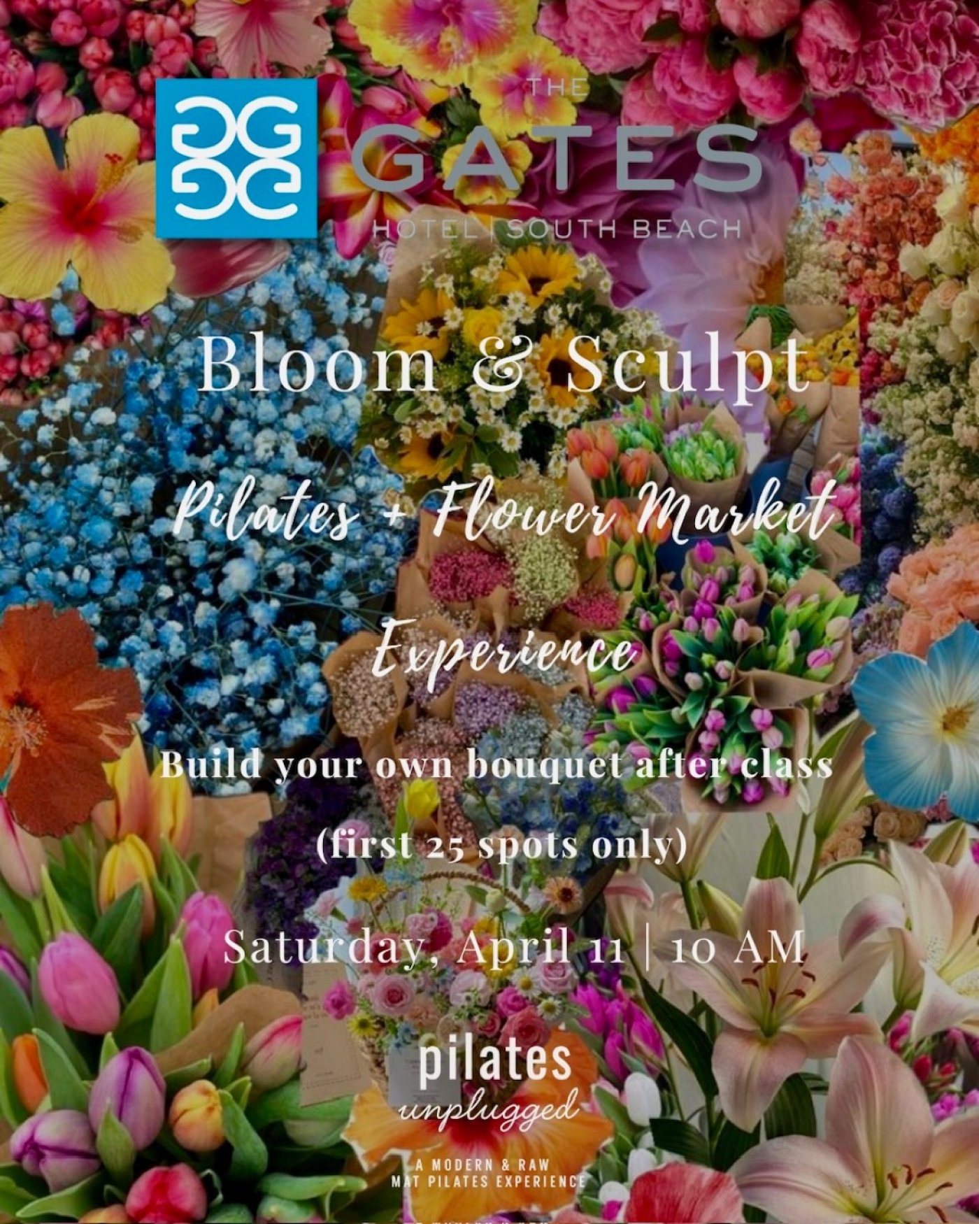 Pilates Unplugged presents Bloom & Sculpt at The Gates Hotel South Beach on Saturday, April 11 at 10 a.m., a spring-inspired, poolside experience designed to energize, sculpt and connect. Guests will enjoy a guided Pilates class followed by a signature “Bloom Bar,” where the first 25 attendees can create their own custom bouquet to take home. The morning also features curated wellness pop-ups, including matcha by Eden’s Table; beauty services like massages, brows and permanent jewelry; plus an optional photography experience by Soulshine Aura to capture your energy. Bring a friend with a two-for-$70 offer or grab early-bird tickets starting at $40.