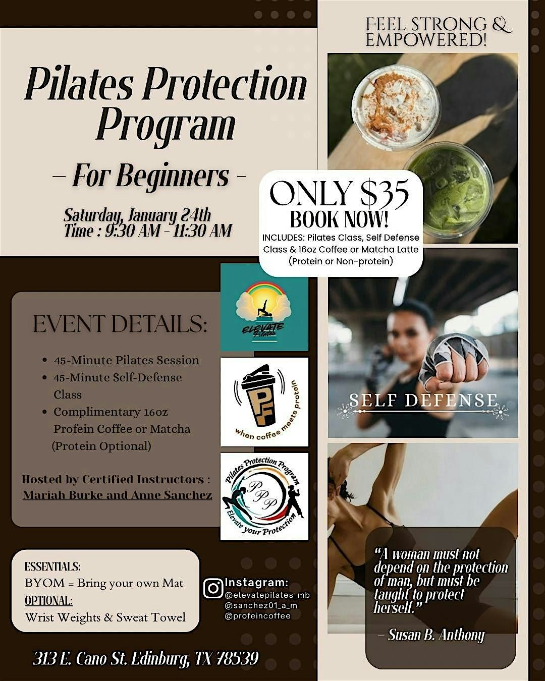 Welcome to the Pilates Protection Program! Join us on Saturday, January 24th, 2025 at 9:30 AM at the cozy Profein Coffee for a blend of fun and fitness. Get ready to sip on delicious lattes and refreshments from PROFEIN COFFEE after enjoying an invigorating 45 min pilates class with MARIAH BURKE and an eye opening Self Defense Class led by ANN Sanchez. Whether you're a fitness enthusiast or just looking for a unique coffee experience, this event is perfect for you. Come mingle with like-minded individuals and enjoy a relaxing Saturday morning. Don't miss out on this unique combination of pilates and lattes!