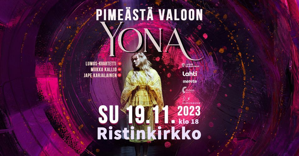 Pimeimpään vuodenaikaan järjestettävän ja vuosi vuodelta suosiotaan kasvattaneen Pimeästä valoon -tapahtuman vieraaksi saapuu tänä vuonna valovoimainen laulaja-lauluntekijä Yona. Yonan lisäksi lavalla nähdään vahvasti lahtelaisia voimia: tapahtuman taiteellinen tuottaja Miikka Kallio, Lumos-jousikvartetti sekä lahtelaislähtöinen basisti Jape Karjalainen.