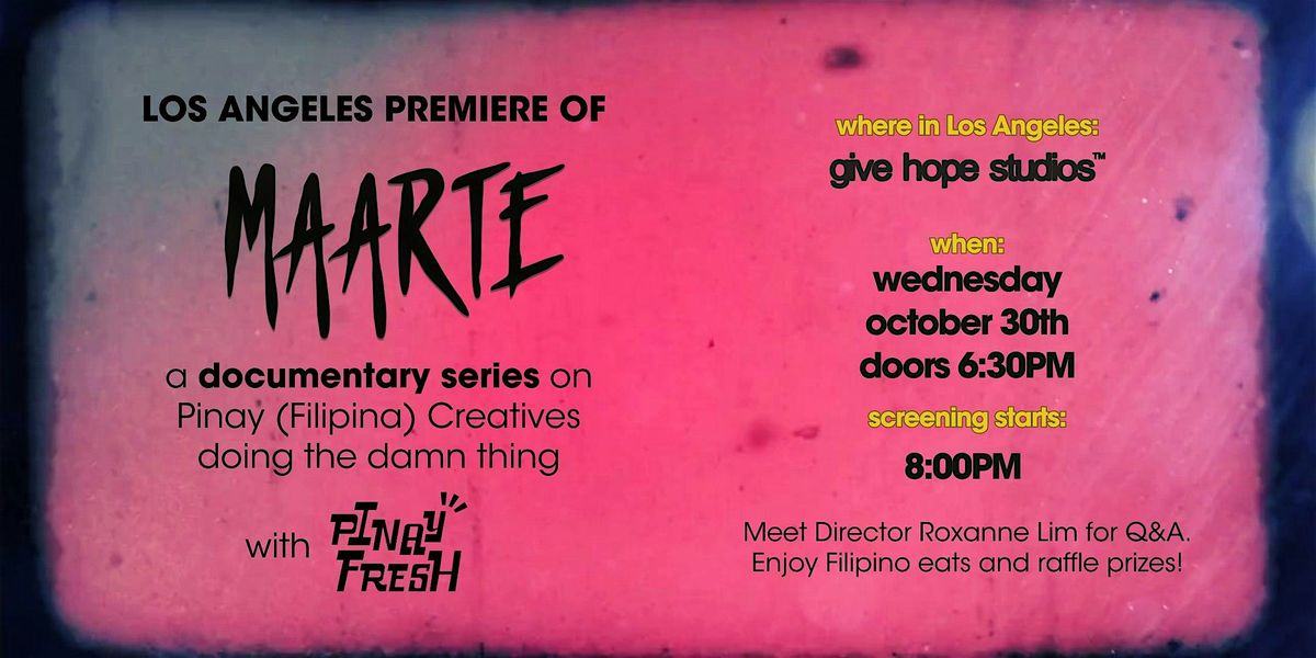 Come join us for the very first Pinay Fresh IRL gathering and LA premiere of Maarte, a documentary series on Pinay (Filipina) Creatives from across the diaspora doing the damn thing. We will welcome New Yorker, Roxanne Lim, director of Maarte for an intimate Q&A prior to the screening.