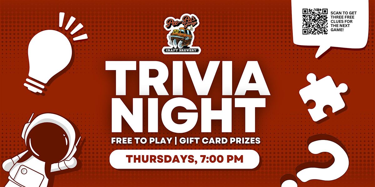 Join us for free live trivia every Thursday at 7pm at Pee Pa's Garage Craft Brewery in Pinellas Park, FL! Free to play, and top teams win gift card prizes!