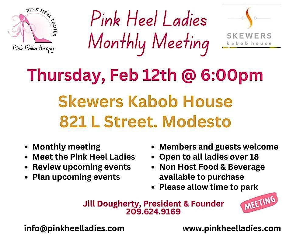 The Pink Heel Ladies are a women's group that gets together and helps raise funds and awareness for our local non profits and local community organizations. We choose various charities over the year to support and help with their fundraising goals.We are holding our monthly meeting at the delicious Skewers Kabob House in Modesto. Please join us for a night of fun, friendship and philanthropy. We are finalizing our 2026 calendar. Come and meet The Pink Heel Ladies, hear about our mission and enjoy a night out with fun ladies. Guest Speaker. Pink Heel Ladies welcomes all ladies over the age of 18. We are a welcoming group. You do not need to be a member to attend. Pink heels are not mandatory. Please feel free to reach out via email: [email protected] or text Jill @ 209-624-9169 for more information. Follow us on Facebook and check out our website! Tell a friend. Bring a friend.