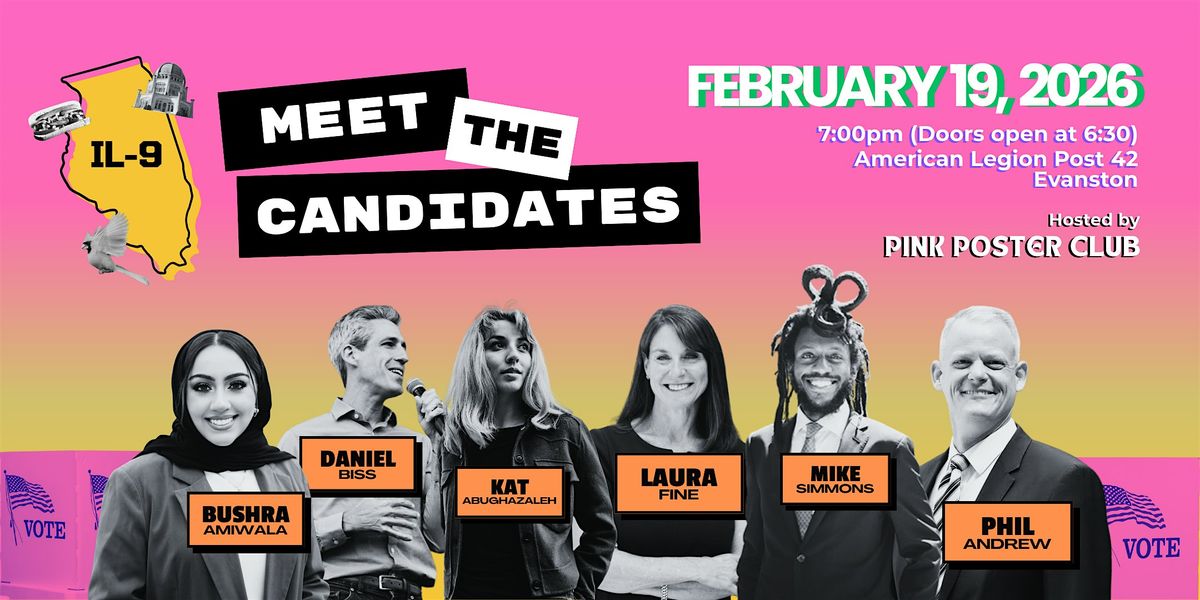 We’ve got a primary coming up on March 17, 2026 where we’ll decide who will be the Democratic candidate for the 9th Congressional District of Illinois. Join Pink Poster Club for an in-person event at the American Legion where you can meet several of the candidates running. Have a beer, meet new people, and hear from several of the candidates hoping to represent you in Congress. Don't miss out on this casual and informative gathering – your voice matters!