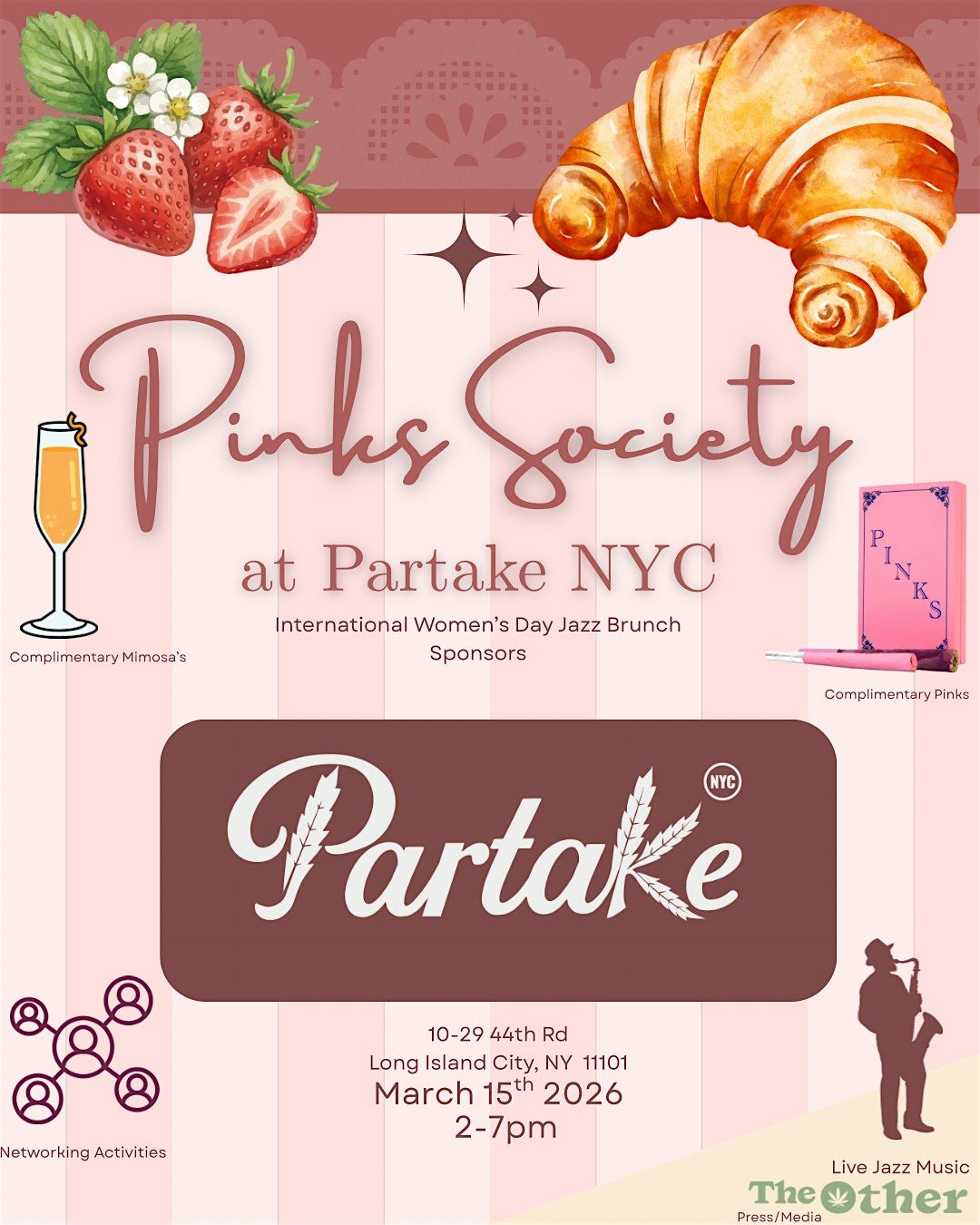 Join us on March 15th for an elegant afternoon celebrating women, community, and culture at Partake NYC for Pinks Society, a curated International Women’s Day brunch hosted by Pinks at Partake NYC. Guests will enjoy a fixed brunch menu, two complimentary mimosas, live jazz and DJ performances, networking with industry leaders and creatives, and a complimentary Pinks preroll to elevate the experience. This stylish gathering blends luxury brunch energy with music, media, and meaningful connections in a beautiful setting designed to bring together women in cannabis, fashion, business, and culture. VIP guests will also receive exclusive gift bags featuring Pinks and select brand partners.