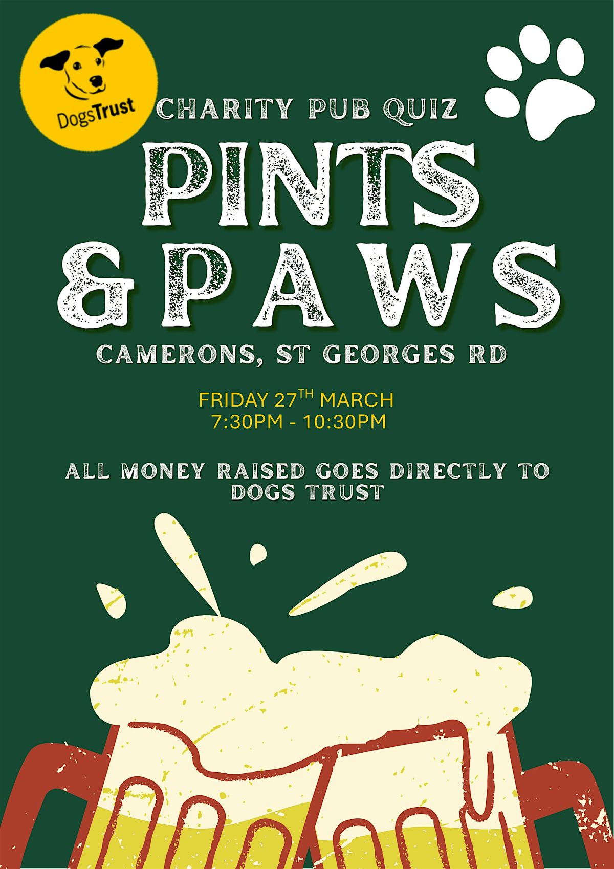 Join us at Camerons on March 27, 2026 at 7:30 PM (GMT) for a fun evening of great drinks and an even better cause! Whether you're a dog lover or just looking to chill with some good company, this event is perfect for you. Bring your pals, grab a pint, and support Dog's Trust.