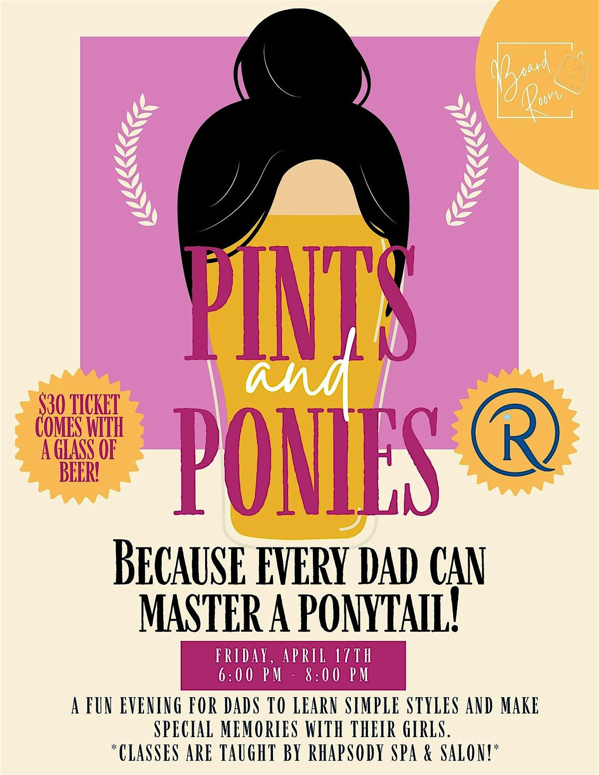 No experience? No problem. Dads are invited to learn the basics: ponytails, braids, and go-to styles you can use at home. Practice on mannequin heads while you build confidence, and enjoy a beer included with your ticket. Class is taught by the wonderful ladies at Rhapsody Spa & Salon!