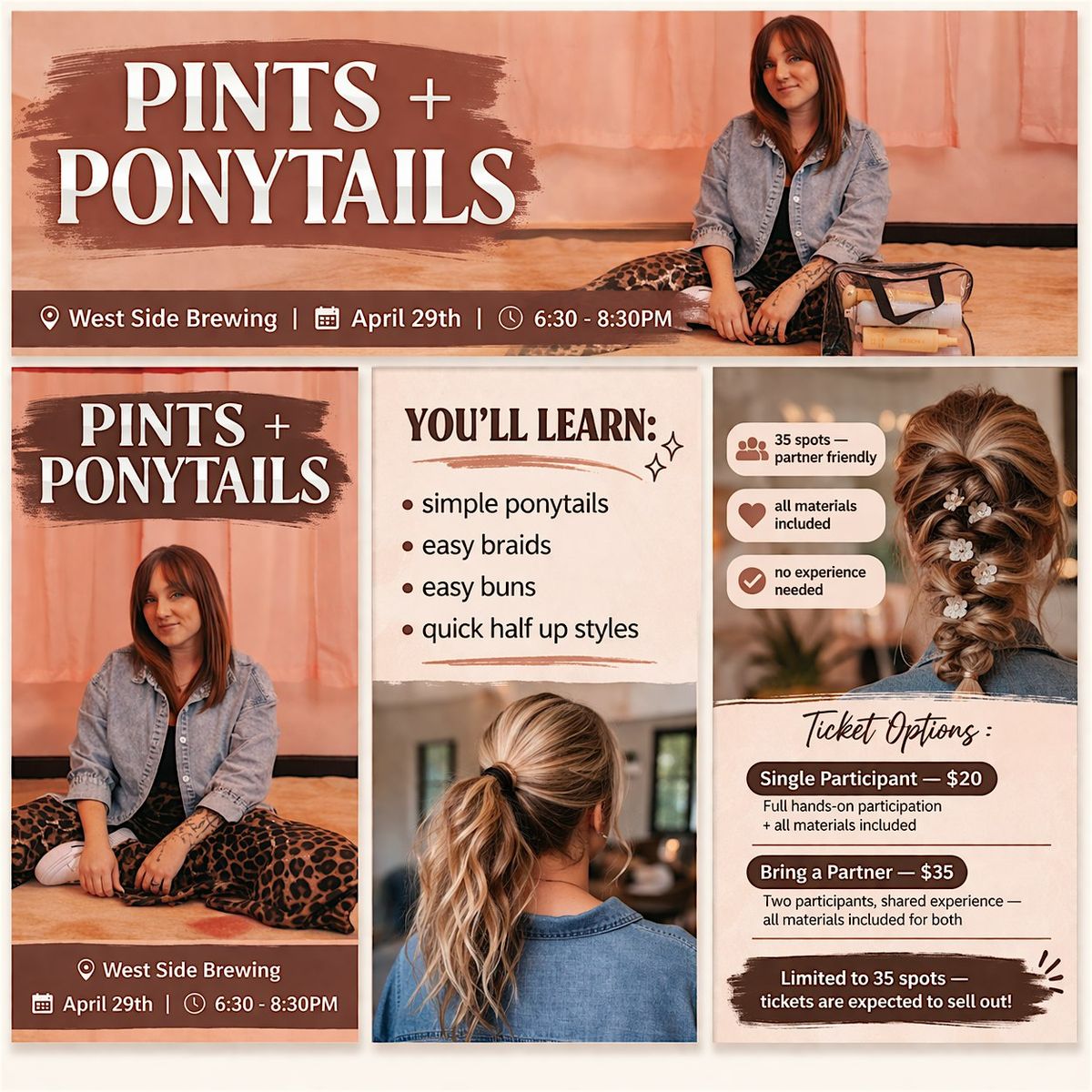 Pints & Ponytails is a hands-on, beginner-friendly hairstyling class designed for parents and those who want simple, realistic styles they can actually recreate at home.