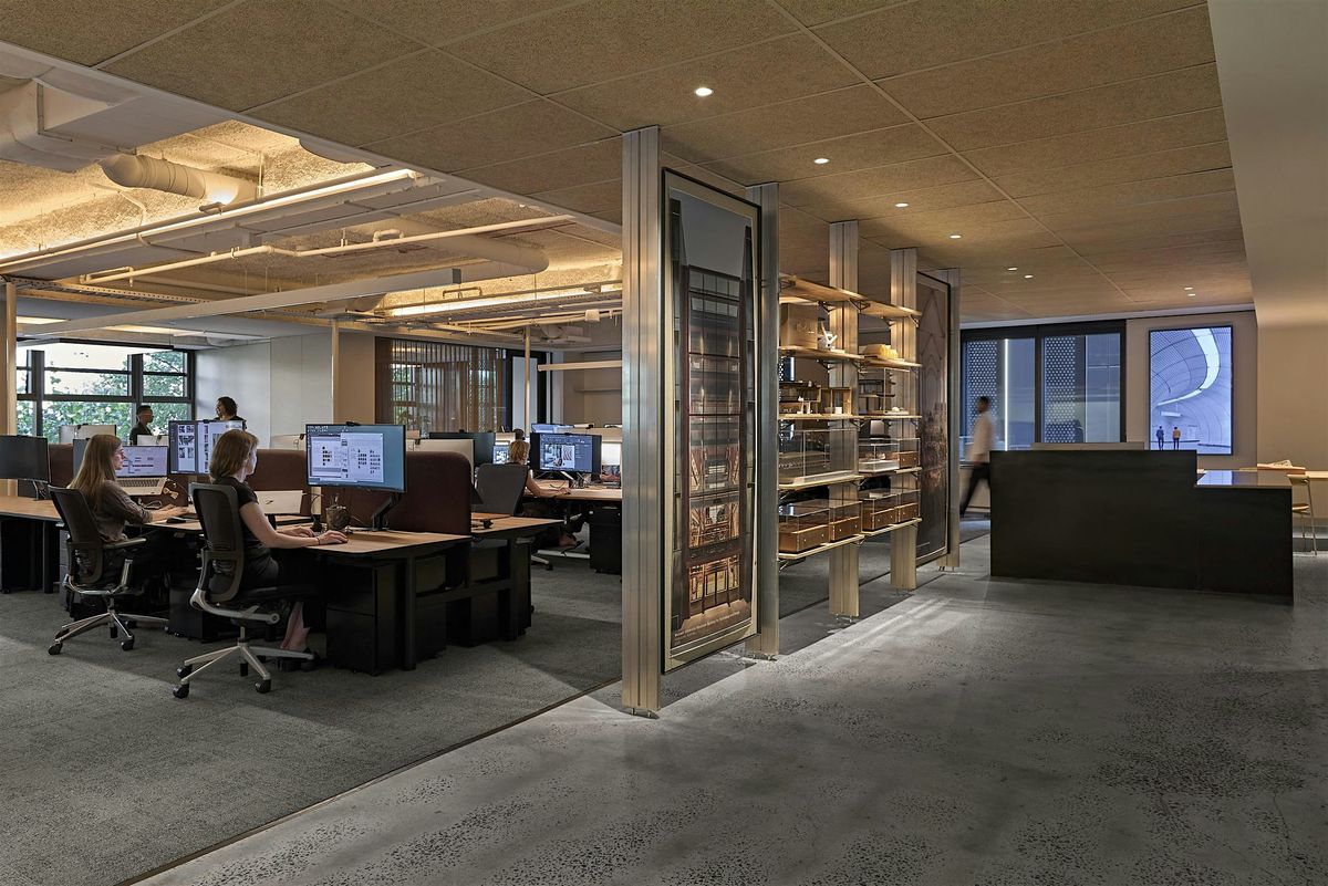 The event also serves as an invitation to experience Grimshaw’s Melbourne Studio, a tangible case study of these principles. The fit-out achieved a 56% reduction in embodied carbon compared to business-as-usual benchmarks by using rigorous design principles to minimise the need for new materials without compromising aesthetics. The interior integrates re-used furniture and building fabric with reclaimed urban salvage timber and high-recycled content cabinetry. Furthermore, the space showcases product innovation through the use of carbon-sequestering Durra Panel waste wheat straw interior walls and adaptable, modular shelving systems.