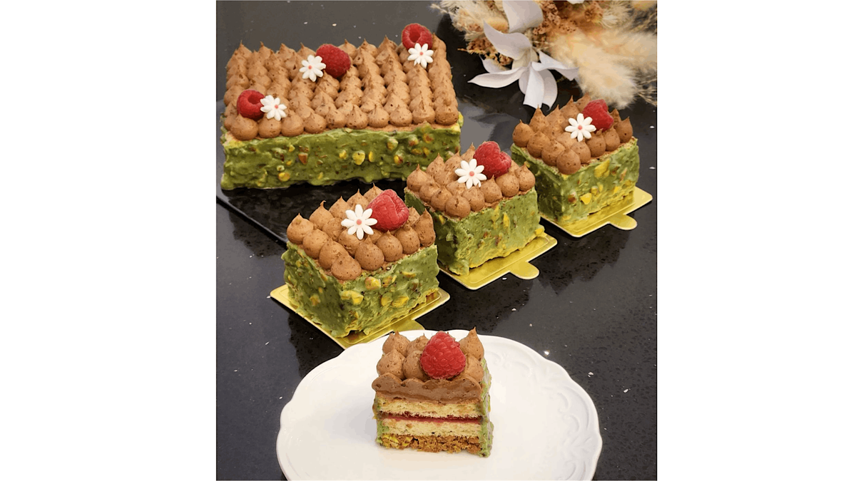A luxurious treat which combines the rich, nutty flavor of pistachios. Layered with raspberry marmalade to balance the sweetness and to bring out the overall flavor. Perfect for pistachio lovers and great for all occasions!