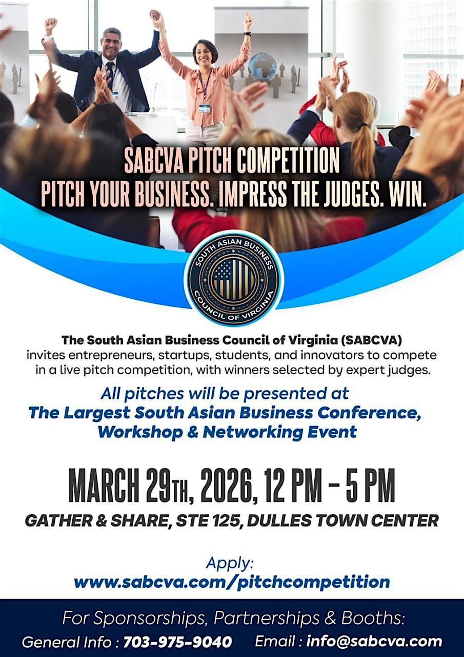 The South Asian Business Council of Virginia (SABCVA) proudly presents the SABCVA Pitch Competition—a dynamic platform where startups, entrepreneurs, and students pitch live before elite judges and compete for prizes, funding, and real-world opportunities.