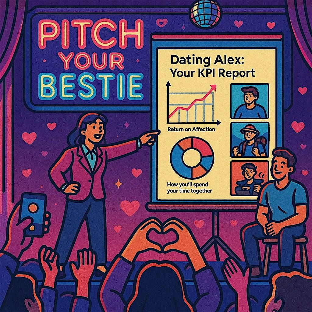 ✨ 4 rounds – 3 bestie pitches per round – max 5 mins each ✨The post-pitch mingle is where the real fun (and flirting) begins.