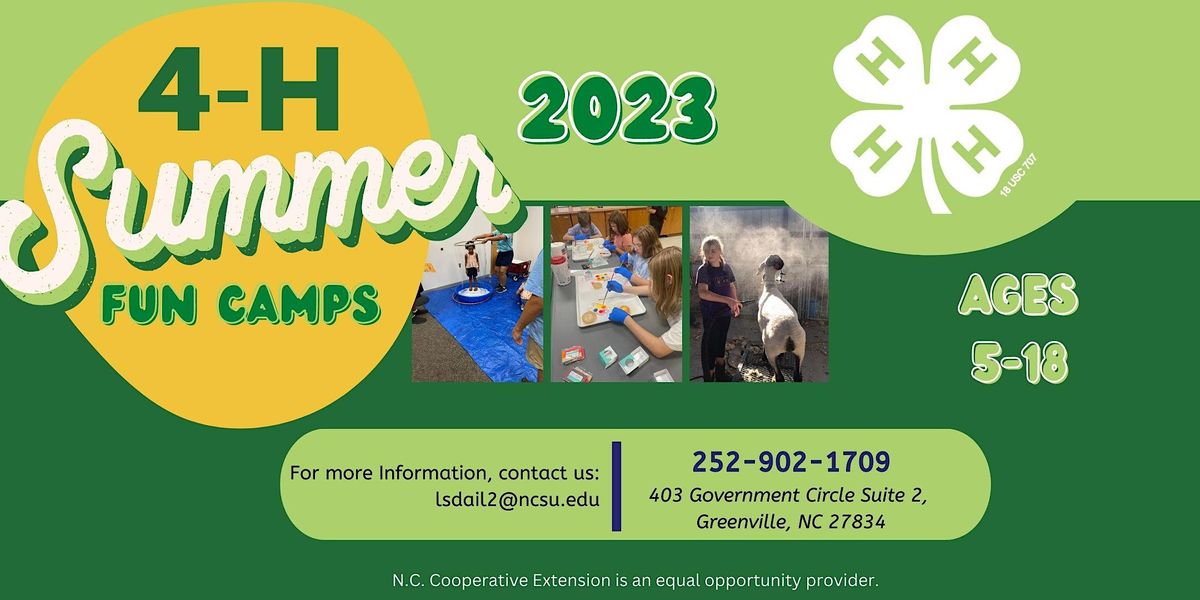 4-H is the youth development program of North Carolina Cooperative Extension. Pitt County 4-H offers Summer Fun – a series of educational camps designed to build life skills through shared experiences and handson learning. Youth must be 5 to 18 years of age as of January 1, 2023.