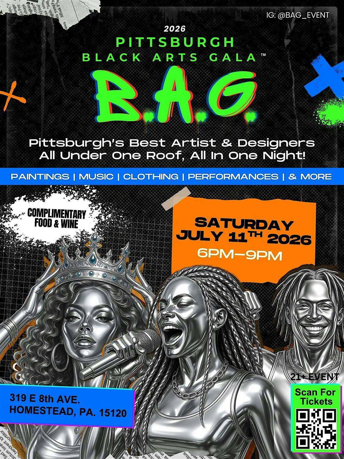 Get ready for an unforgettable night at the Pittsburgh Black Arts Gala! This in-person event celebrates the vibrant creativity and culture of Black artists right here in Pittsburgh. Come mix, mingle, and experience amazing paintings, clothing, performances, inspiring art for sale, and a community that’s all about uplifting artist. Whether you're an art lover, music lover or just looking for a fun night out, this event has got something special for you! Don’t miss out on this unique celebration!