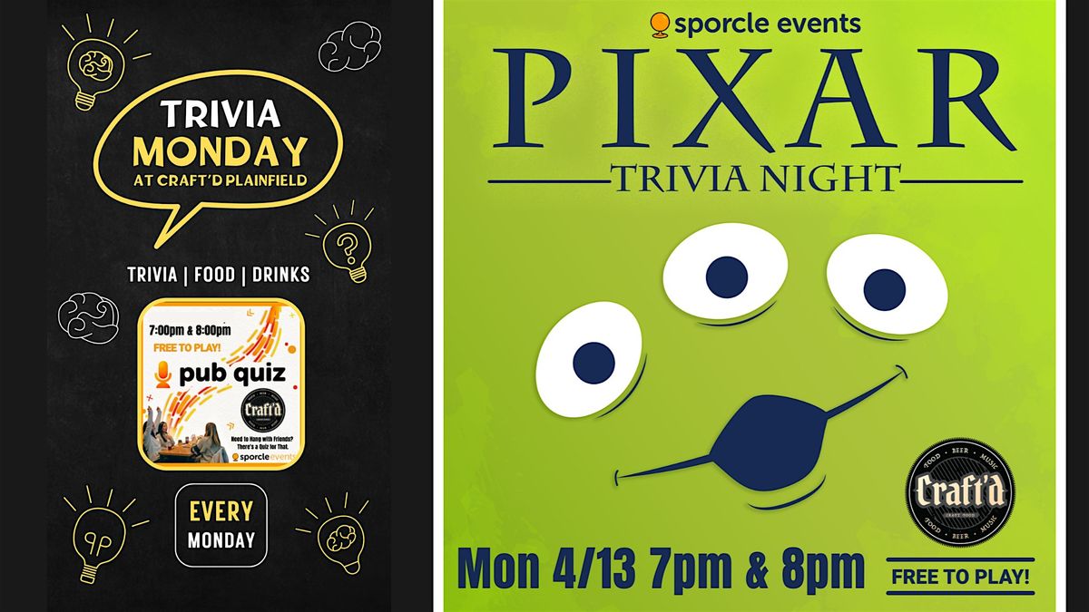 Pixar Films Monday Trivia at Craft'd Plainfield at 7 & 8 PM. Free to Play.