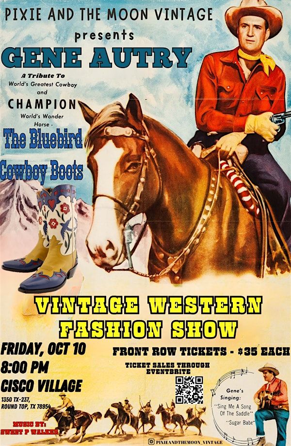Step into the spirit of the American West with a one-of-a-kind fashion show celebrating the life and legacy of Gene Autry, the legendary “Singing Cowboy.” This tribute event will showcase Western vintage fashion—all set to Autry’s iconic style and songs, including his famous cowboy boot design The Bluebird. This unforgettable evening is both a fashion celebration and a heartfelt homage to one of America’s most beloved cultural icons.